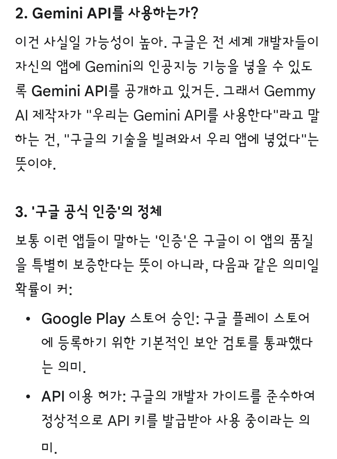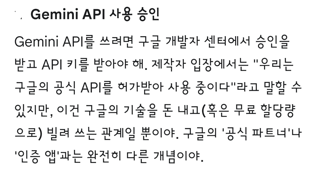 Gemini API 사용: 이건 구글의 기술을 돈 내고(혹은 무료 할당량으로) 빌려 쓰는 관계일 뿐입니다. 누구나 신청하면 쓸 수 있는 것이지, 구글이 이 앱의 품질을 보증한다는 뜻이 절대 아닙니다