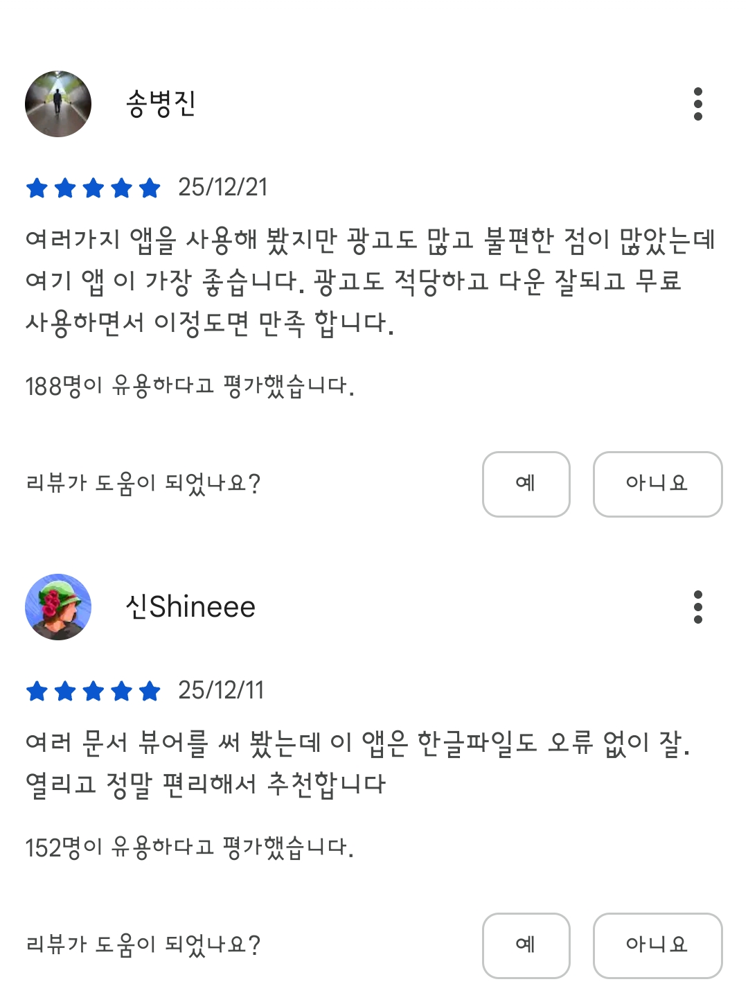 구글 플레이스토어 리뷰를 보면 이 앱의 진가를 알 수 있습니다. 별점 5점의 높은 평가는 물론이고, 특히 리뷰마다 '도움이 되었다'고 평가한 인원이 수백 명에 달할 정도로 사용자들의 지지가 압도적입니다.